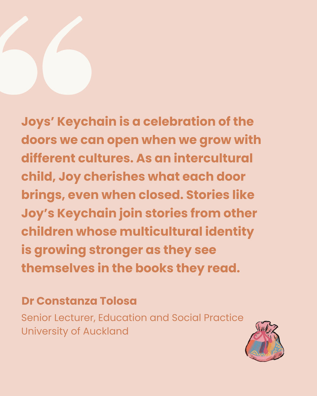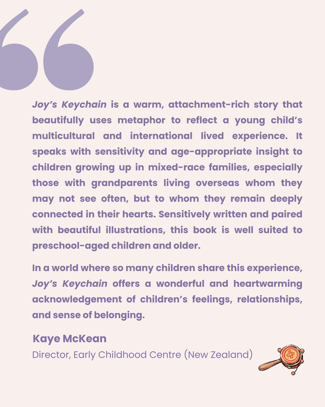 In the illustrations, a living room filled with Chinese, Korean, and New Zealand toys reflects Joy’s multicultural world. A half-open suitcase symbolizes the rhythm of movement and change in a Third Culture childhood — full of stories carried across borders. Both the suitcase and the keys appear again in other Roots & Wings picture books, forming quiet threads across stories. At the end of the book, readers are invited to talk about their own keys and doors — a doorway that leads back to the feeling of home.