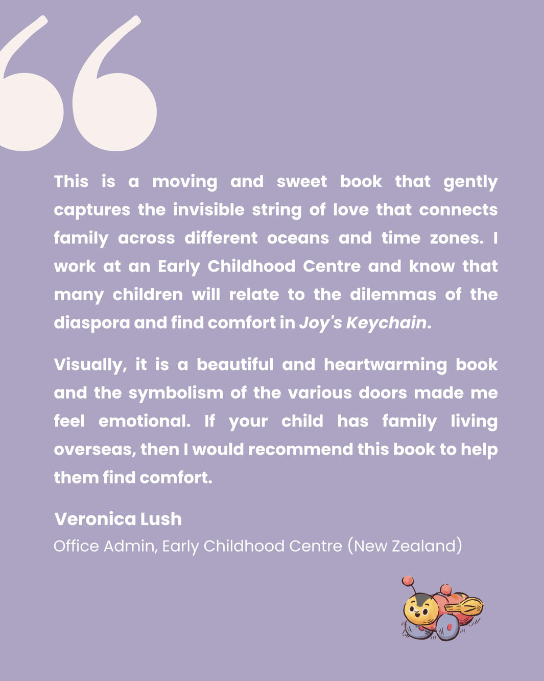 Inspired by real family journeys across New Zealand, China, and Korea, Joy’s Keychain is a gentle yet resilient picture book about how children navigate distance, connection, and the weight of saying goodbye.As Joy uses her special keys to open three magical doors right in her living room, she discovers a beautiful truth: the people and places we miss are never truly out of reach. Love can cross any ocean, and our most precious worlds can always be kept close at hand, right in our pockets.Warm, tender, and emotionally resonant, this story opens conversations about belonging, change, and family love across distance.